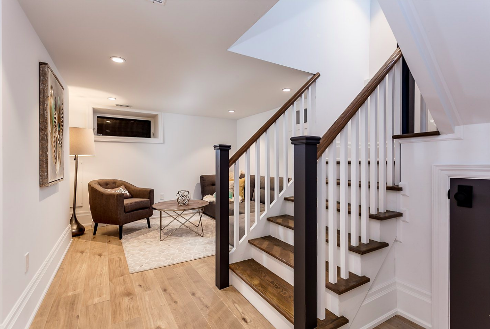 There is a lot of exposed brick that I don't love normally but kind of like here, especially as the backsplash. I'm not sure what the stair layout was before but the way it is now kind of sections of the house awkwardly. The front hall and the walk way to the rest of the house is basically the living room so that is awkward.
