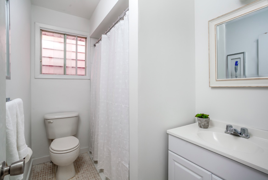 Upstairs, the bedrooms are a good size with an updated bathroom. Only thing is, if you get migraines, those white floors might not be the best, but that is a really easy change.