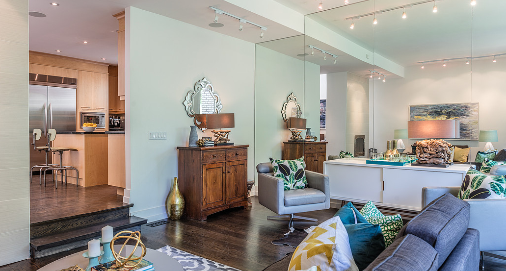 The walls are still mirrored. There is still track lighting (which I don't have a problem with but it has probably been there for decades). And the carpet on the second floor is still the same.